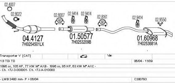 Раб. объем (округленный) - 1,9; тип модели - TDi TD; вар. оснащения - Van; Число дверей - BBBBB; Г. вып. от - 06/2004; раб. объем (точн.) - 1896; код двигателя - AXC; № шасси от - >7J-3-000001; № шасси до - <7J-A-010000; Исполнение днищевой планки - Kat; мощность - 63